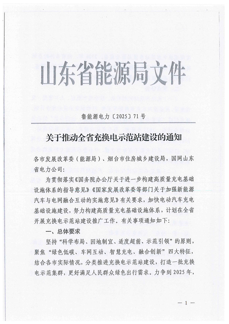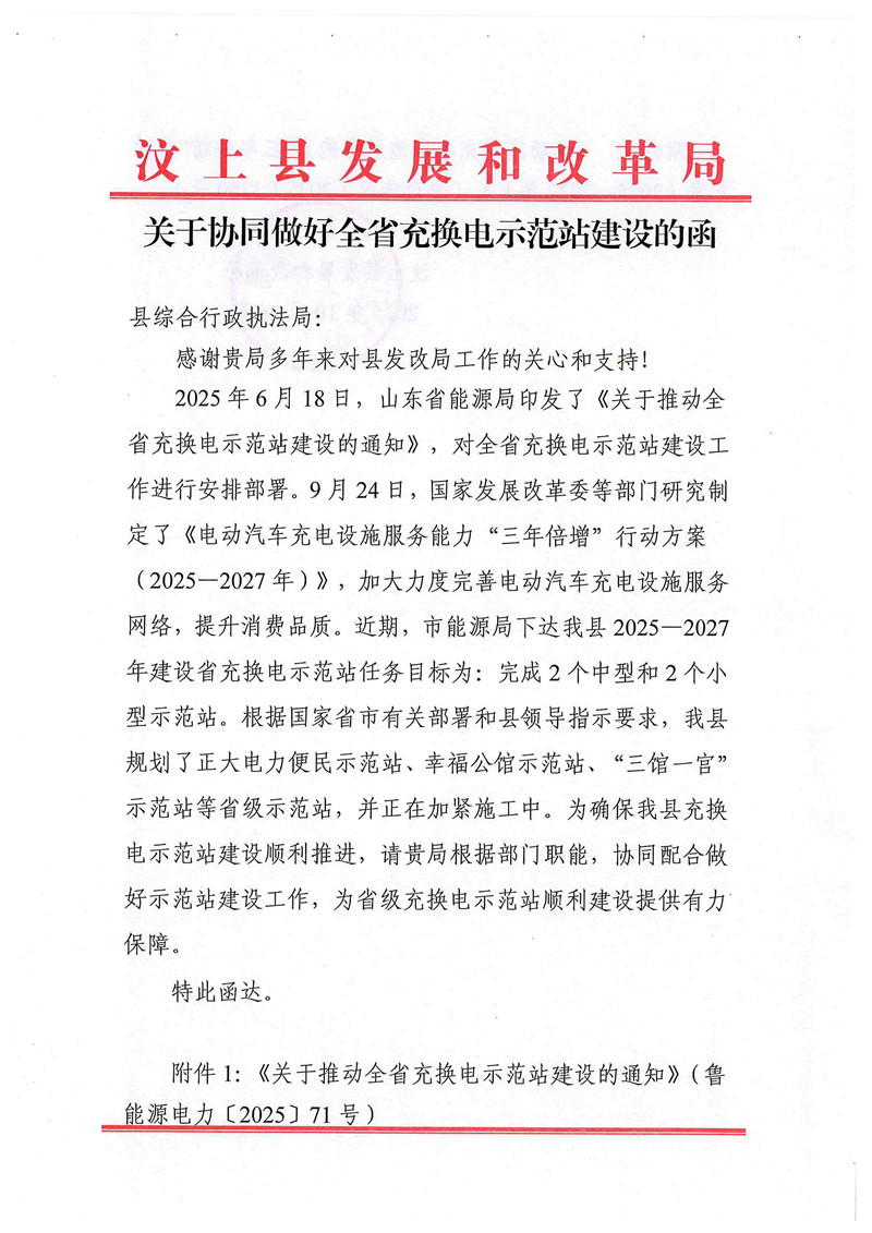 感謝貴局多年來對縣發改局工作的關心和支持!2025年6月18日,山東省能源局印發了《關于推動全省充換電示范站建設的通知》,對全省充換電示范站建設工作進行安排部署。9月24日,國家發展改革委等部門研究制定了《電動汽車充電設施服務能力“三年倍增”行動方案(2025-2027年)》,加大力度完善電動汽車充電設施服務網絡,提升消費品質。近期,市能源局下達我縣2025-2027年建設省充換電示范站任務目標為:完成2個中型和2個小型示范站。根據國家省市有關部署和縣領導指示要求,我縣規劃了正大電力便民示范站、幸福公館示范站、“三館一官’示范站等省級示范站,并正在加緊施工中。為確保我縣充換電示范站建設順利推進,請貴局根據部門職能,協同配合做好示范站建設工作,為省級充換電示范站順利建設提供有力保障。